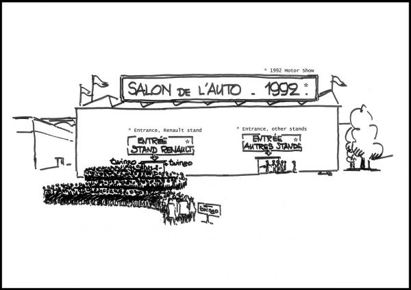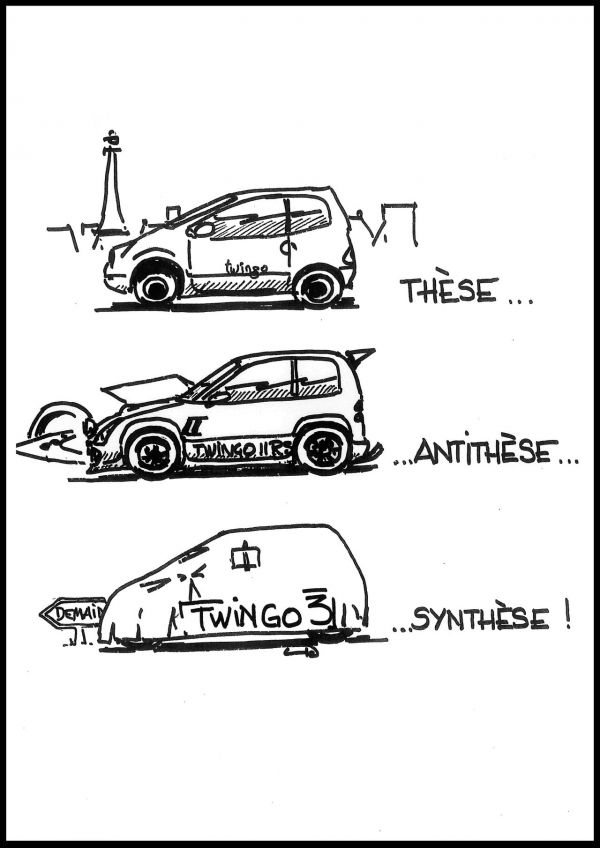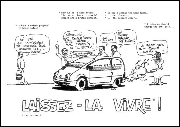 Twingo fête ses 20 ans cette année. La « grande-petite » Renault n’aurait jamais vu le jour sans la persévérance et la pertinence – voire l’impertinence – de son directeur de projet : Yves Dubreil. Célèbre dans toute l’entreprise pour son franc parler et un triptyque ‘barbe, pipe et bretelles’ qui vaut toutes les cartes de visite, Yves Dubreil se fait aussi remarquer par ses dessins. Grâce à eux, il faisait passer ses messages avec force, emportant, les décisions les plus importantes.