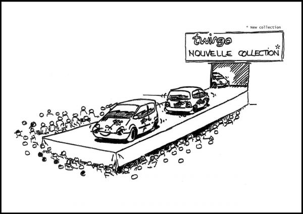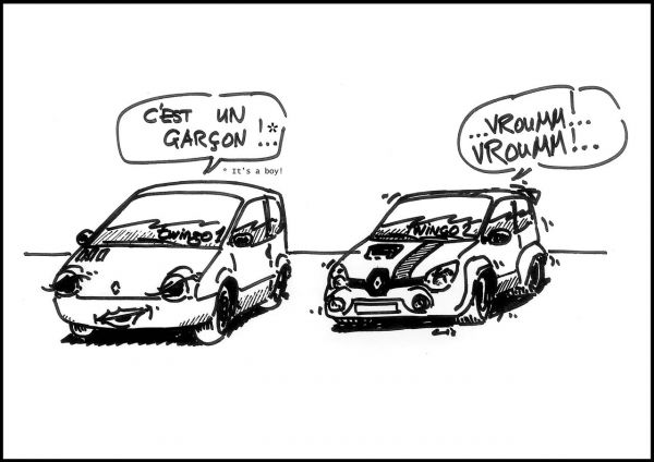 Voici 20 dessins autour des moments forts de la vie de Twingo, tous signés de la main du père de la turbulente citadine. Ils sont autant de clins d’œil à l’aventure humaine et aux équipes du projet original, comme à celles qui font vivre le modèle actuel et préparent déjà les petites Renault de demain. Avec le même esprit créatif, innovant et parfois décalé qu’il y a 20 ans !
